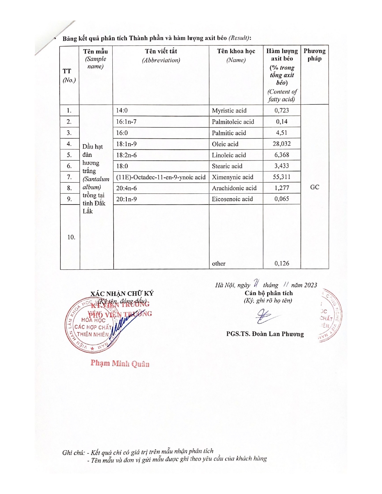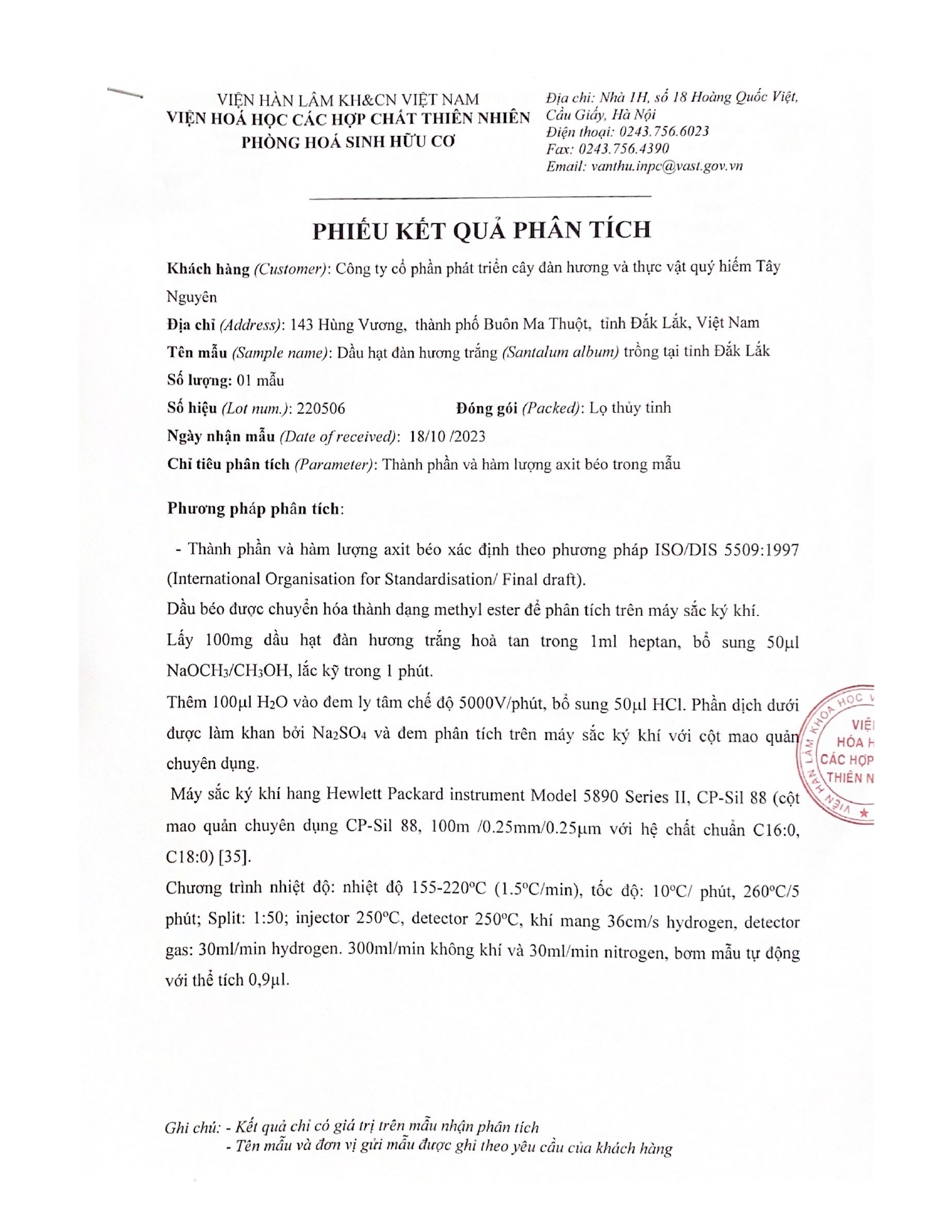 Từ lâu dầu hạt chiết xuất từ cây Đàn hương đã được biết đến với các tác dụng kì diệu của mình. Với kết quả phân tích từ Viện Hàn lâm Khoa học & Công nghệ Việt Nam, Tập đoàn Đàn hương Việt Nam tự tin khẳng định uy tín và chất lượng với sản phẩm dầu hạt Đàn hương được Tập đoàn cung cấp.