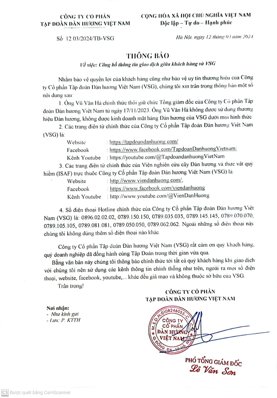 Công ty Cổ phần Tập đoàn Đàn hương Việt Nam (VSG) trân trọng công bố thông tin giao dịch giữa khách hàng và Tập đoàn từ ngày 12-03-2024