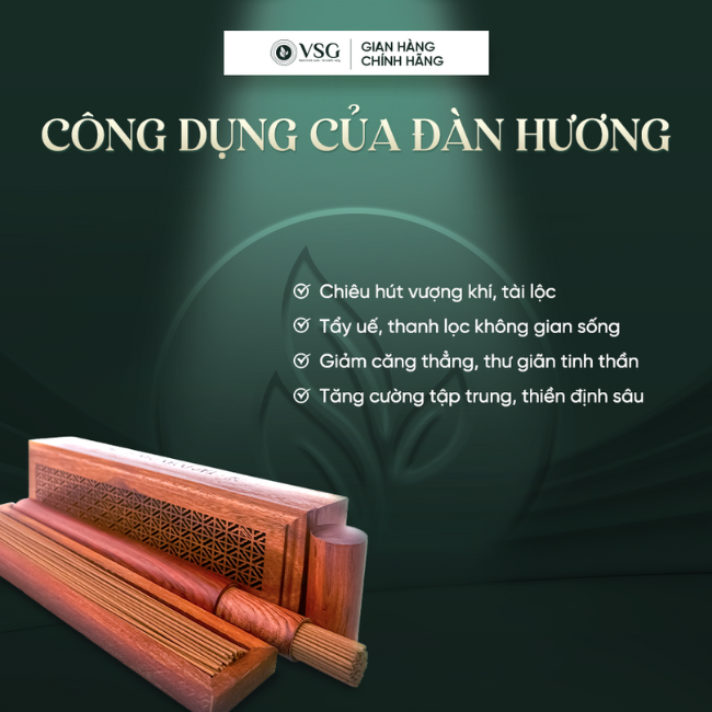 – Giải tỏa căng thẳng, mệt mỏi: Hương thơm dịu nhẹ của Đàn hương giúp giảm căng thẳng, xoa dịu tâm trí và mang lại cảm giác yên bình. Đặc biệt, hỗ trợ cải thiện giấc ngủ sâu và mang lại tinh thần sảng khoái khi thức dậy, từ đó dễ dàng phục hồi trạng thái cân bằng và năng lượng tích cực để tiếp tục công việc.