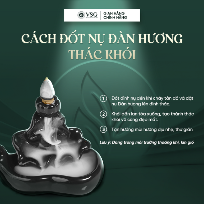 Bạn dùng bật lửa đốt đỉnh nụ, sau đó lấy tay phẩy nhẹ nhàng và đặt nụ Đàn hương trên đỉnh thác. Khói sẽ dần lan tỏa xuống bên dưới, tạo thành thác khói vô cùng đẹp mắt.