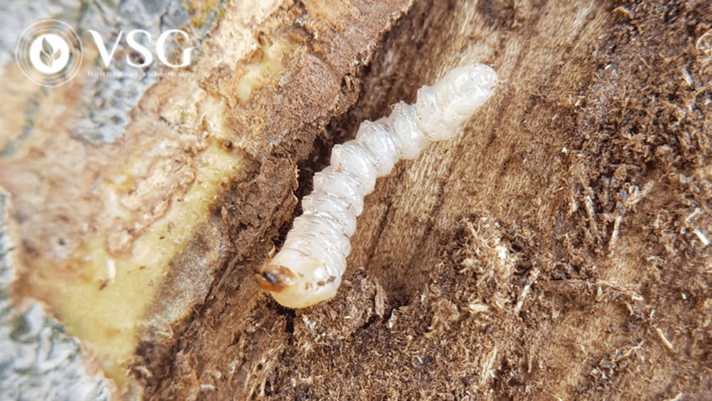 Dấu hiệu: Xuất hiện lỗ nhỏ trên thân, có mùn gỗ quanh gốc; khi cạo lớp vỏ, thấy đường đi của sâu.