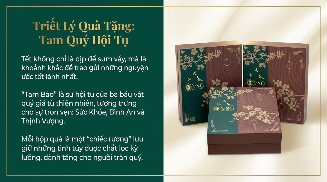 “Tam Bảo Thịnh Phúc” đại diện cho ba giá trị cốt lõi mà VSG mong muốn gửi gắm trong mỗi món quà Tết: Sức khỏe – Bình an – Thịnh vượng.