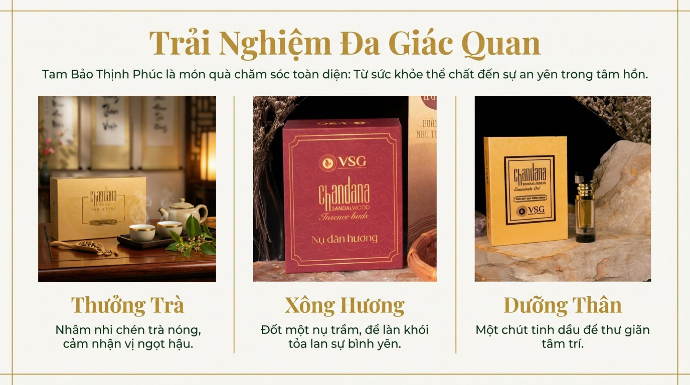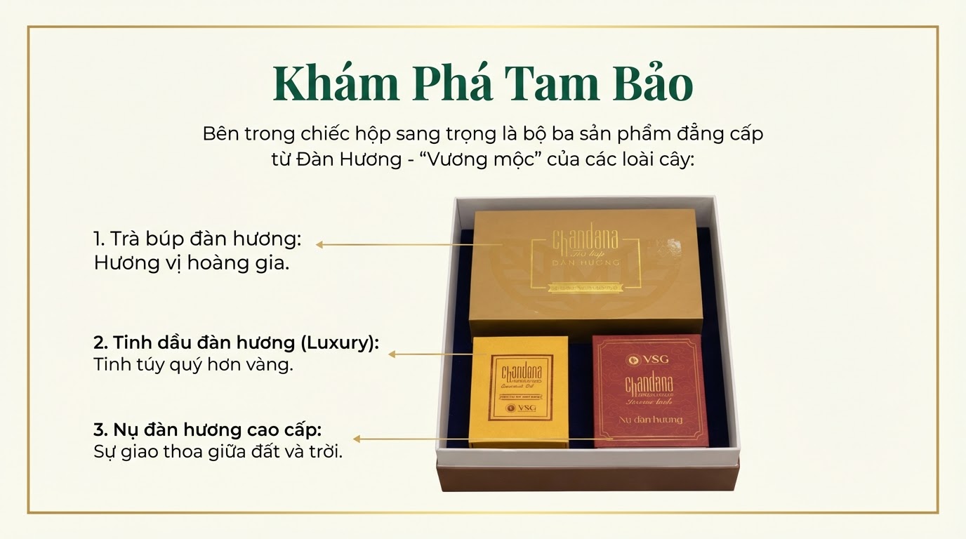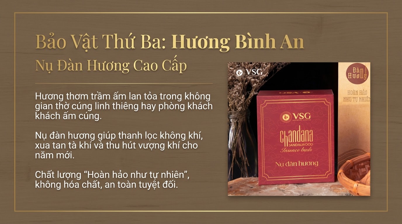 Set quà Tết Tam Bảo Thịnh Phúc của VSG – tinh hoa Đàn Hương Việt, quà biếu đối tác, khách hàng và gia đình với thông điệp bình an, sức khỏe.