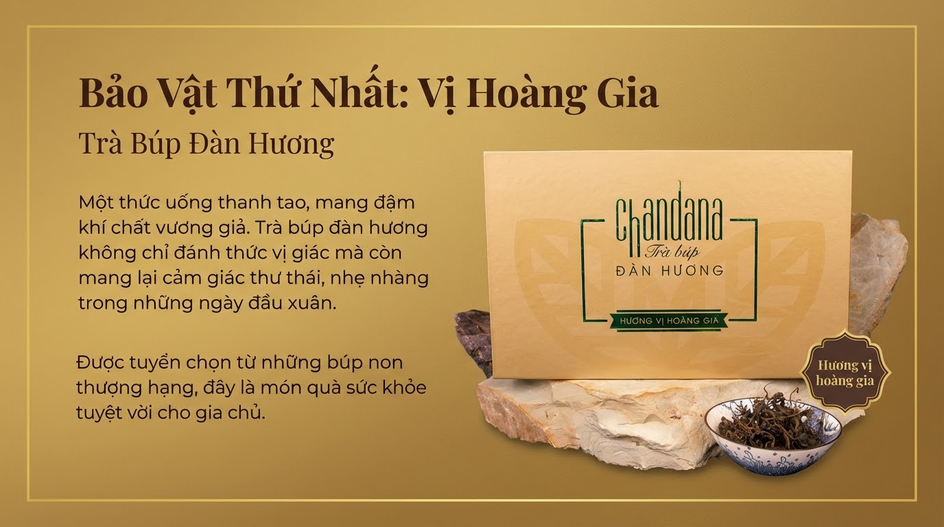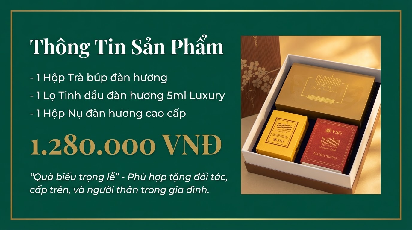 Lấy Đàn Hương làm trung tâm, kết hợp cùng các nguyên liệu thiên nhiên chọn lọc, set quà mang đến trải nghiệm hài hòa giữa thưởng trà, thưởng hương và nuôi dưỡng thân – tâm – trí trong những ngày đầu xuân.