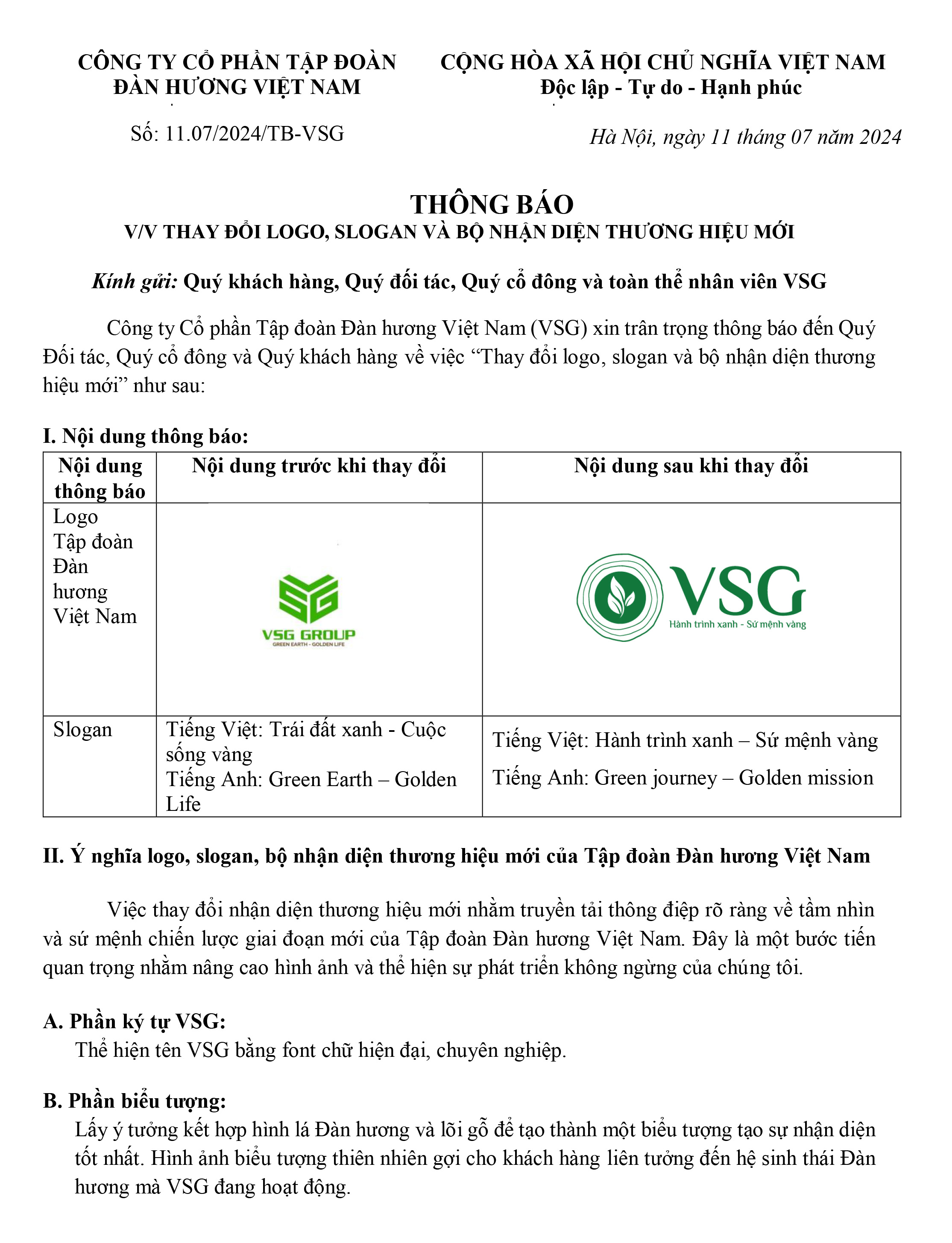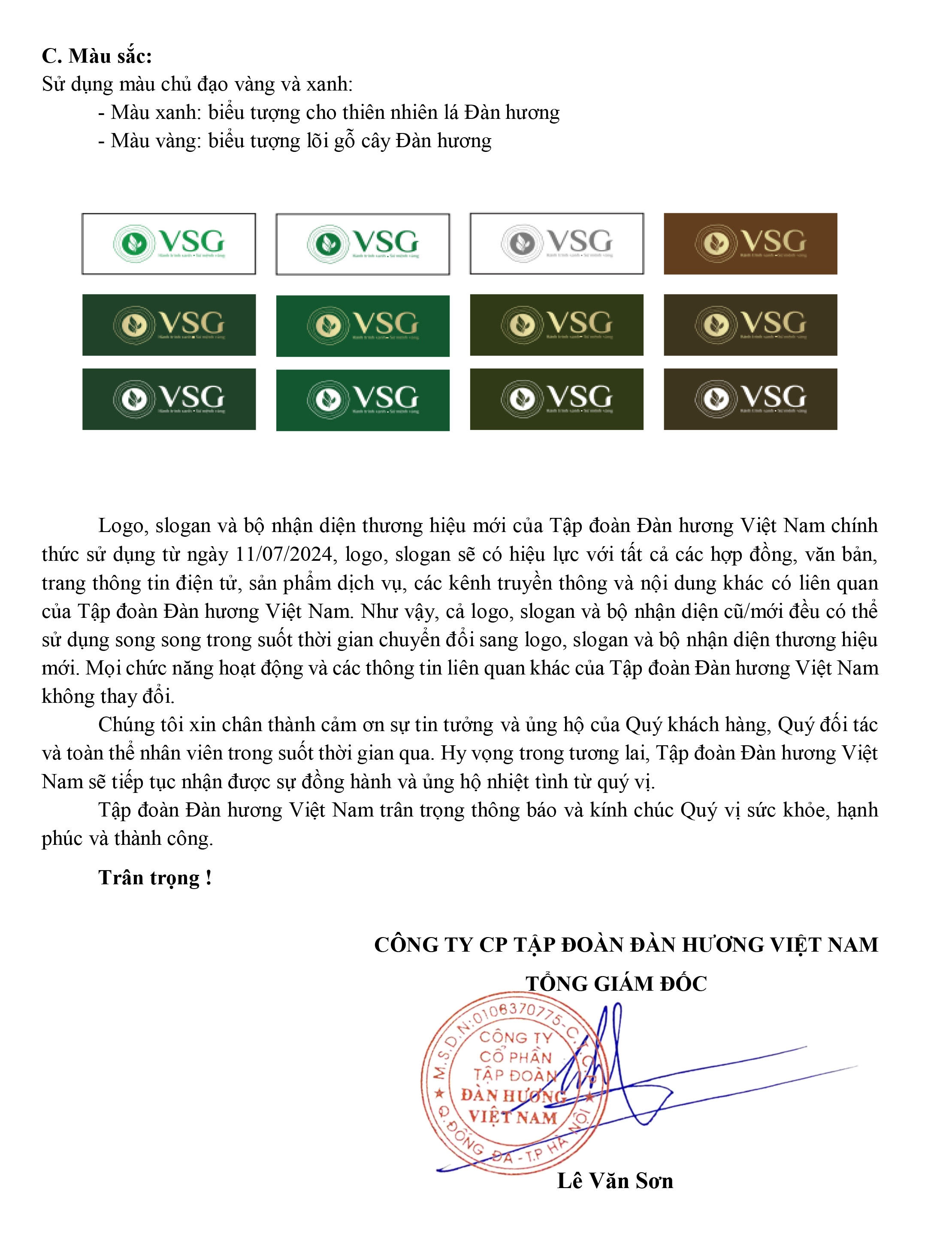 Logo, slogan và bộ nhận diện thương hiệu mới của Tập đoàn Đàn hương Việt Nam chính thức sử dụng từ ngày 11/07/2024, logo, slogan sẽ có hiệu lực với tất cả các hợp đồng, văn bản, trang thông tin điện tử, sản phẩm dịch vụ, các kênh truyền thông và nội dung khác có liên quan của Tập đoàn Đàn hương Việt Nam. Như vậy, cả logo, slogan và bộ nhận diện cũ/mới đều có thể sử dụng song song trong suốt thời gian chuyển đổi sang logo, slogan và bộ nhận diện thương hiệu mới. Mọi chức năng hoạt động và các thông tin liên quan khác của Tập đoàn Đàn hương Việt Nam không thay đổi.